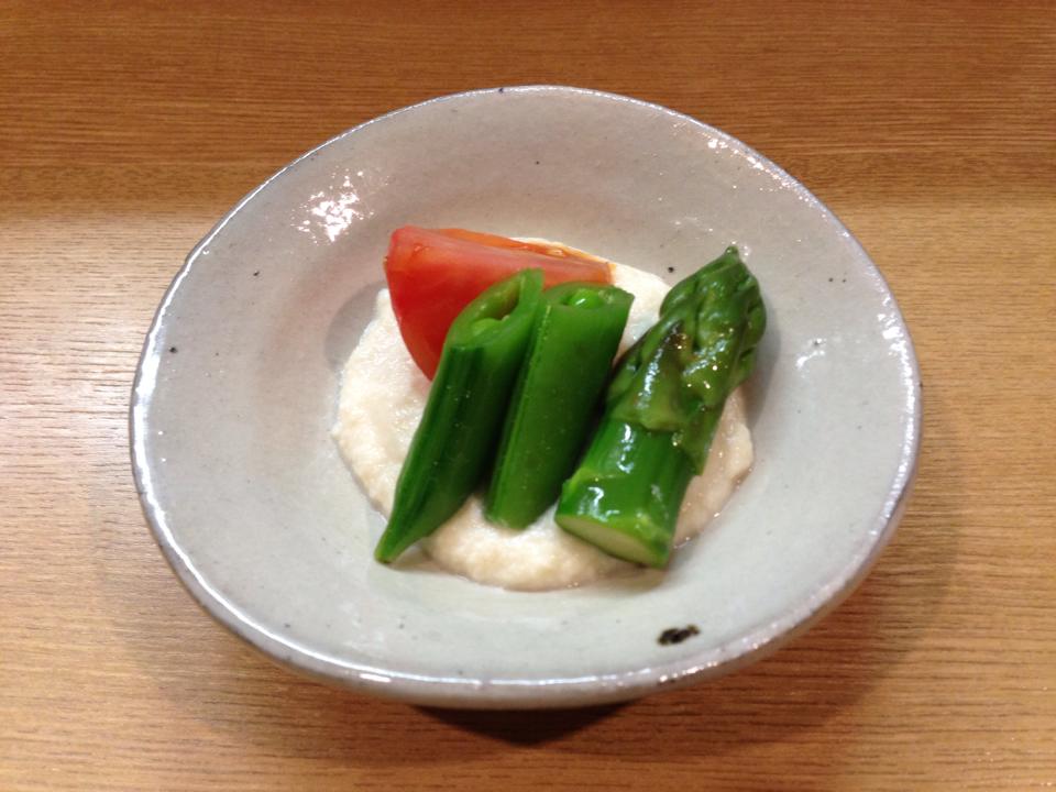 春野菜の煮物。豆腐を酢で溶いて、クリーム状にしたものの上に、野菜を。素晴らしい。ちょこっと、フレンチのニュアンスが加えてあった。旨し。