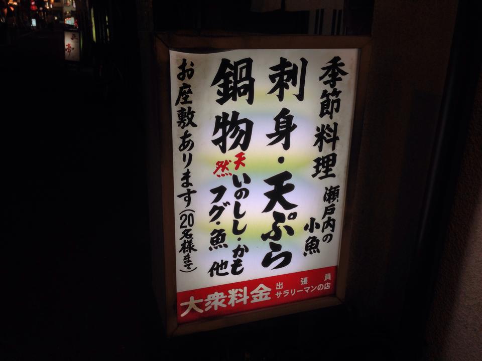 瀬戸前旬料理・小判道場。店構えからしてタダモノではなさそうだが、この「大衆料金・出張員・サラリーマンの店」という表示がなんともいいな。これでいうと当方は、出張員に該当するんだな・・・(笑)