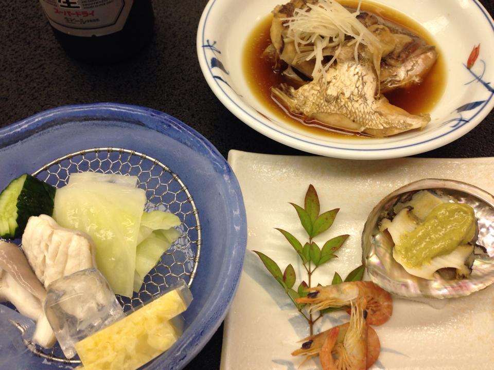 続いての料理。 左はふか、つまり鮫の湯ざらし、そして鯛の煮物。そしてアワビ。こちらは昨日と、重なってない。さすがに豊後水道に面している地域柄、魚介・魚種が豊富なんだろうな。これは実に旨しだった。アワビ、ありがたみがあったな。