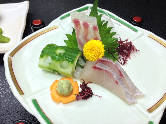 ホテルの夕食。まずはお造り。鯛とハマチ。きゅうりの中に入っているのはイカ。旨いんだが…昨日の小判道場のお造りと、素材が重ならなければなあ。まあ今の愛媛の旬は、共通してるということなんだろな・・・。