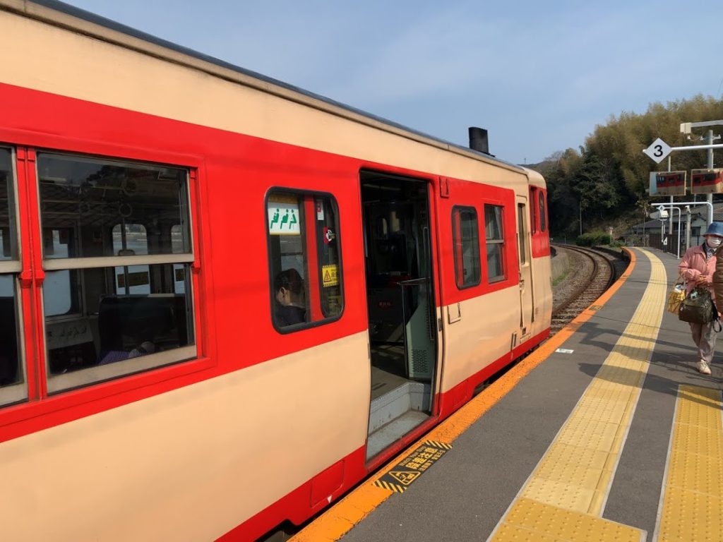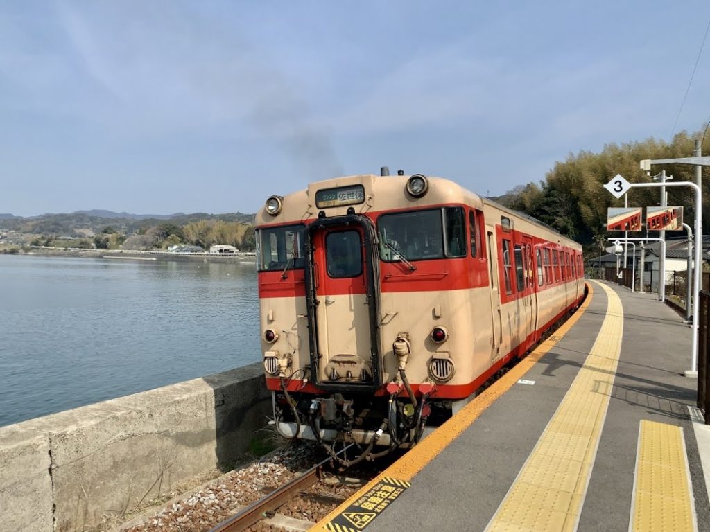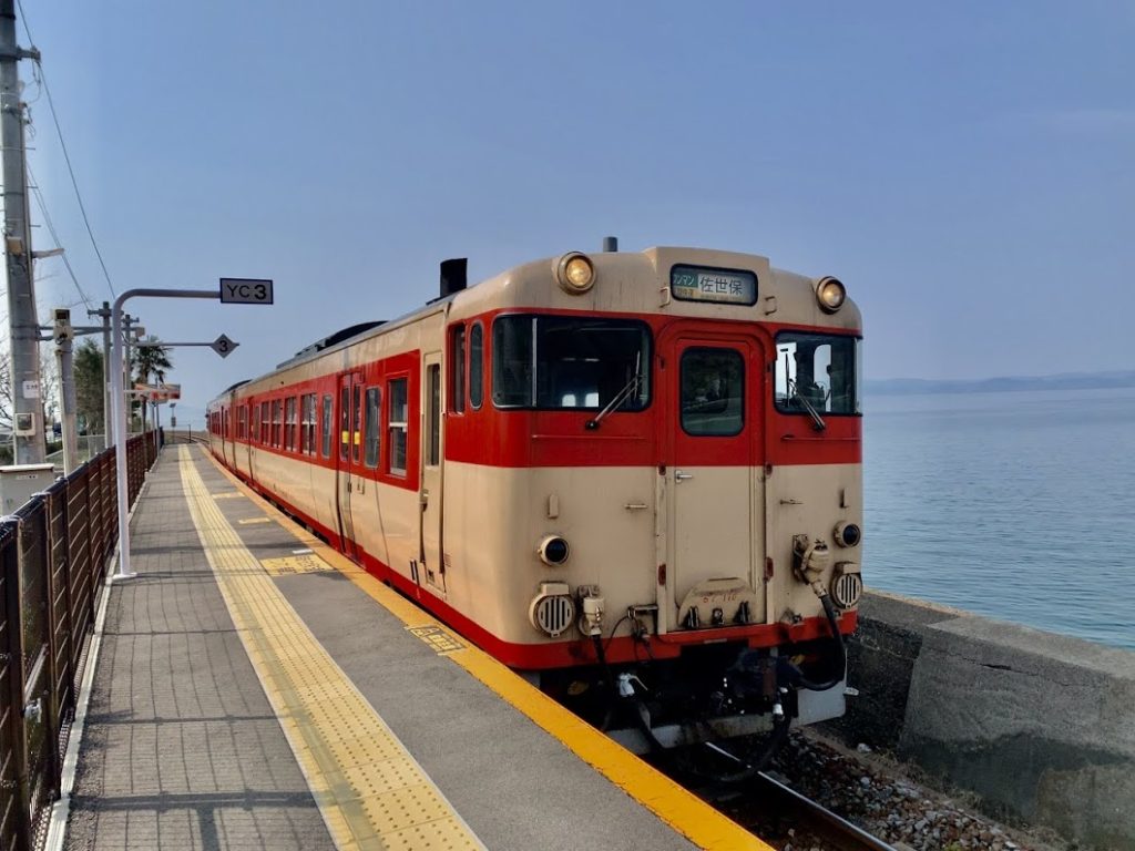 列車がやってきた。佐世保行きのシーサイドライナー。キハ47かな。昭和の色。ノスタルジックな感じがたまらない・・・