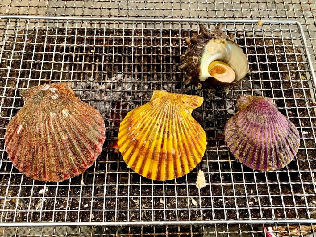 続いてはヒオウギ貝とサザエ。同じように焼いていただく。ヒオウギ貝はホタテ貝に似ているが、産地が九州近くらしい。ホタテと比べると、すこしアクが強い味かな。サザエも上手く焼け、美味しくいただいた。