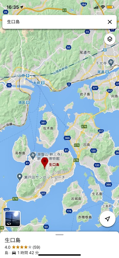 生口島(いくちじま)をアップにした地図。こんな感じなんだが・・・残念。今回は天気に恵まれなかったな・・・