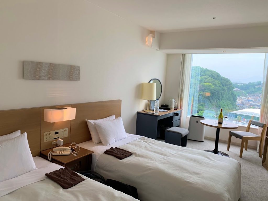 ようやっと到着。グランドプリンスホテル広島。やっぱりここはいいな。2回目だが、今回は山側の部屋。海は右方向に少し見える。前回と部屋の向きが異なるな。でも、やはりいい。この部屋のムード、明るさ、好きだな。