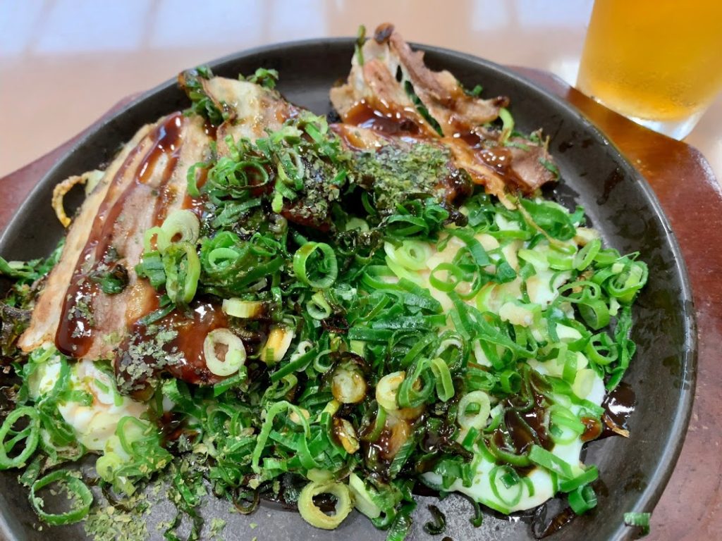 とん平焼きは、目の前で作ってくれた。まずは卵を二つ、ボトボトと落とす。それが目玉焼きになる前に、おびただしい量の青ネギを、卵二つが隠れて余りあるほど乗せて、さらに豚肉の薄切りを乗せる。なんともワイルドな調理方法だな・・