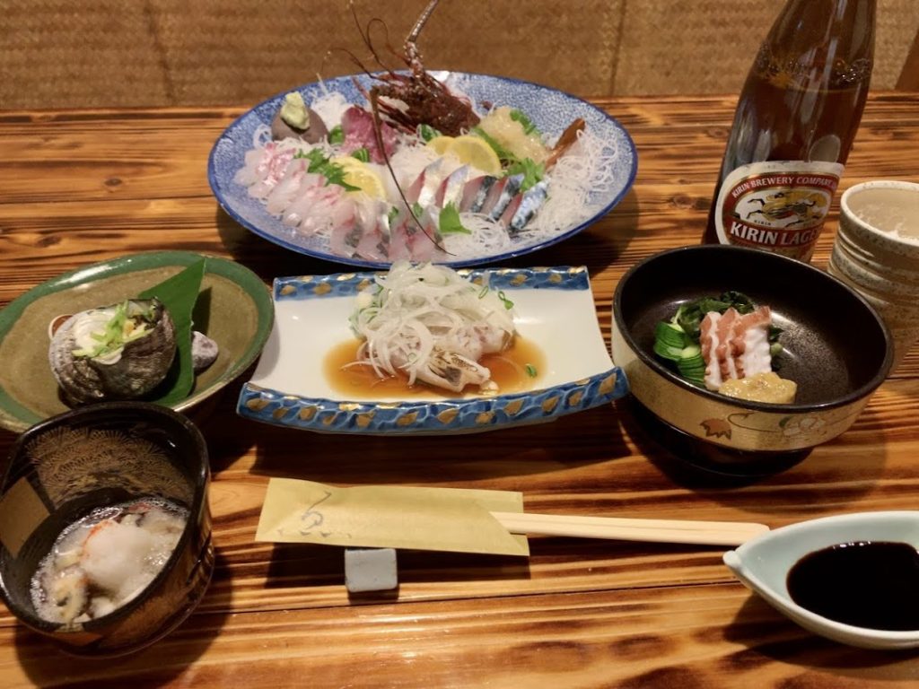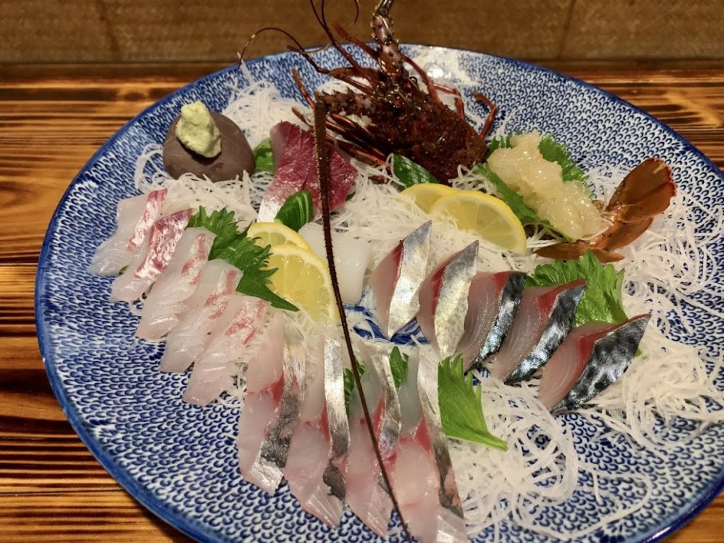 お造り。伊勢エビ、ハマチ、モンゴウイカ、鯛、ヒラメ、そして関あじと関さば(佐田岬で上がったものなので、厳密には岬あじ・岬さば)。