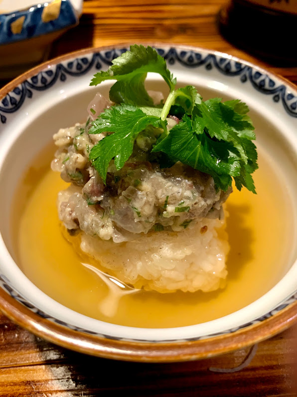 なめろうのお茶漬け。なめろうは今日お造りで出した魚を使っている。出汁は主に、味の骨からとっている。完璧だ…