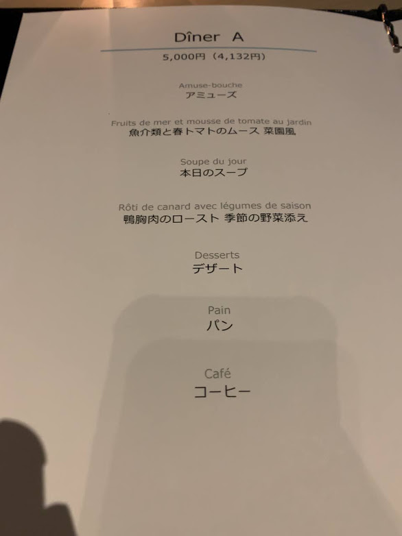 メニューは軽量級。ディナーA ~お手軽なフレンチコース~、お一人様 5,000円を選んだ。