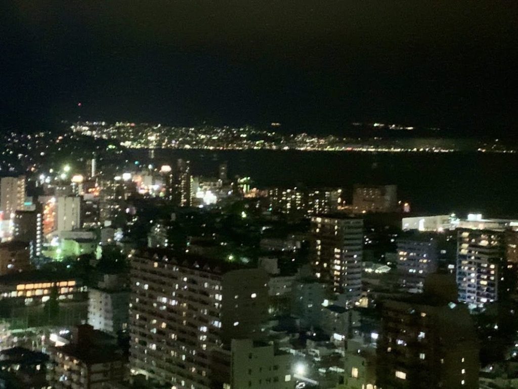 夜景を撮るのは難しいが・・・こんな感じな。こちらは大分、向こうは別府。その中の暗闇は別府湾な。