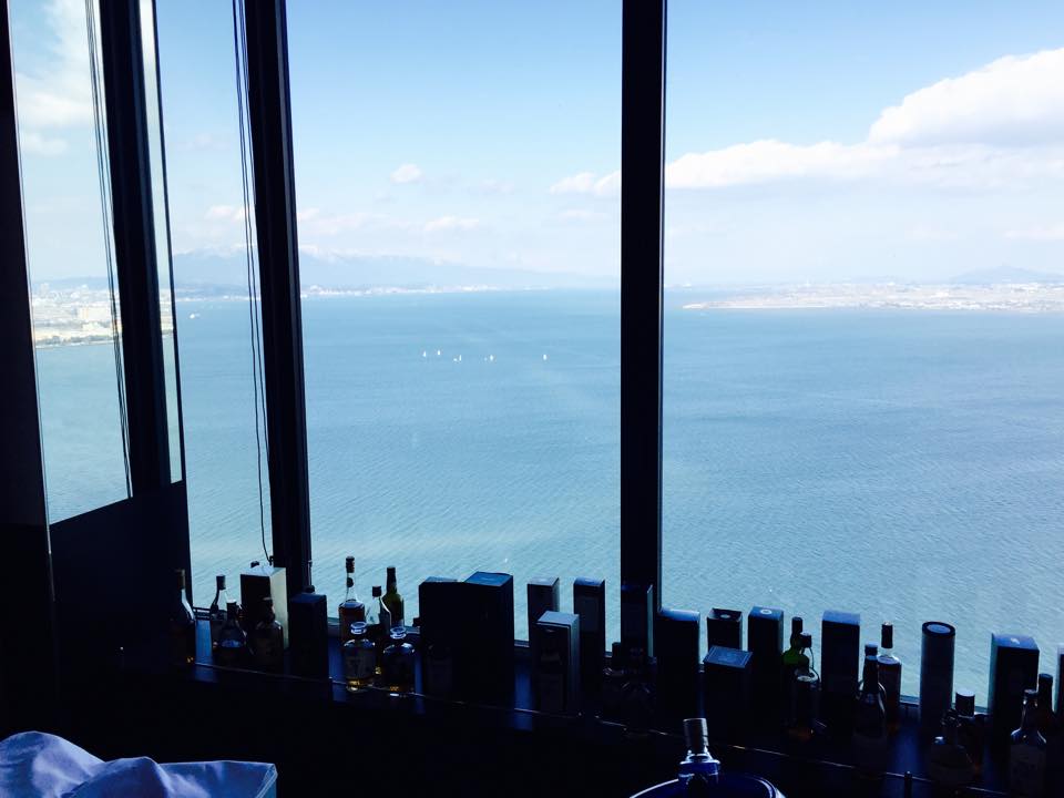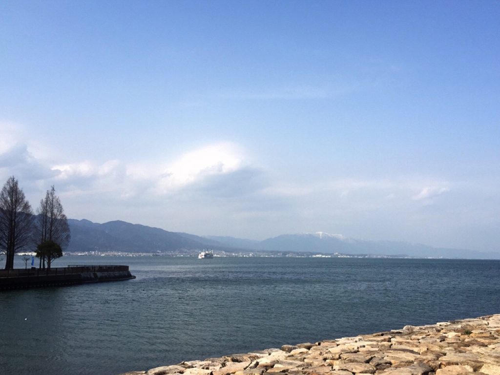ホテルの前の琵琶湖。キレイだよな。対岸の向こうは日本海側。そのせいかうっすら、雪山だな。