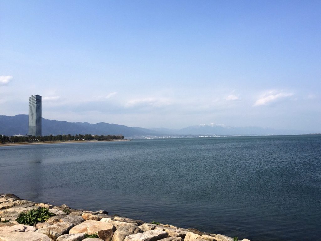 今日はホテルから10分くらい歩いた膳所での仕事。そこからあらためて、琵琶湖を望む。キレイだよな。一見、海のようだが、やはりここは湖。波がないよな。