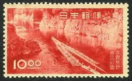 吉野熊野国立公園にある渓谷、瀞八丁(どろはっちょう)を初めて知ったのは、この切手を見たとき。中学生の頃かな。この切手、1949年発行というから。太平洋戦争が終わってわずか4年後に発行されたんだな。ちょっと驚き。これは瀞八丁経由で、新宮へ丸太を運んでいるシーンだそうな。