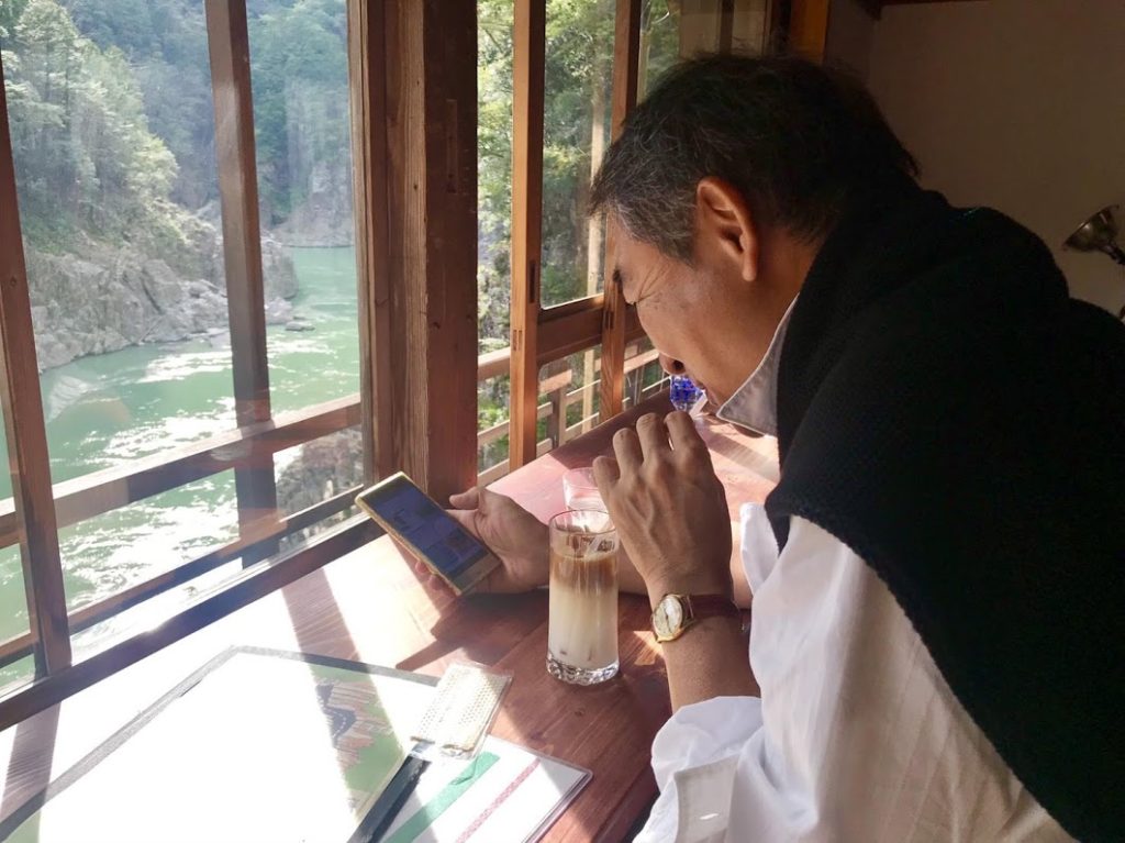 これは件のU氏が、カフェでアイス・オレをいただいてる図。なんとも歴史を感じる佇まい。木造建築。カフェの向こうに瀞八丁が見える。素晴らしい。ムードあるよな・・