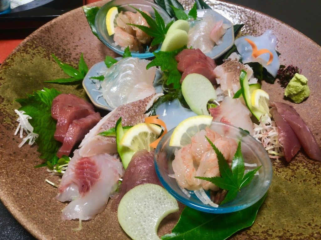 部屋での夕食。まずはお造り!メジナ、ヒラメ、赤いか、まだい、カツオ、カスえび。全て、尾鷲の地のものと。文句なし!盛り付けがもう少し丁寧なら「なお可」だが、とにかく、最高に美味しな。