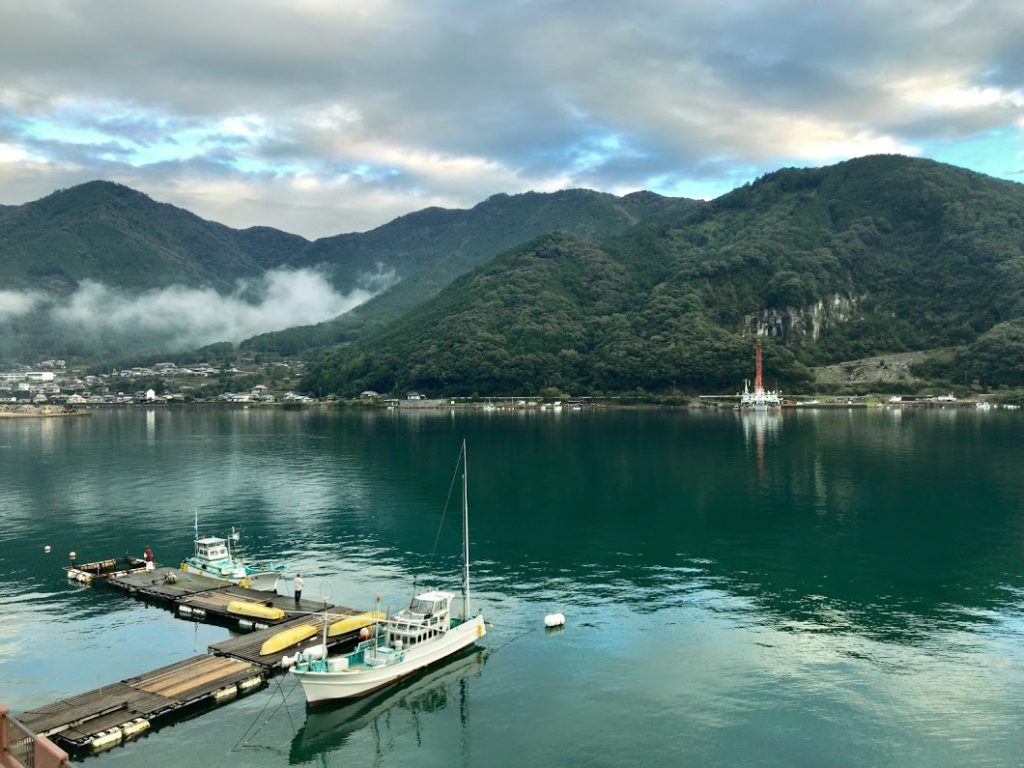 宿の部屋からの眺め。さすがにシーサイドサイドビューを謳うだけあって、尾鷲湾がきれいに見える。窓を開ければさざ波の音が聞こえる。鳥が低く飛ぶのを見ることが出来る。この宿に来て良かったなと感じる瞬間・・・