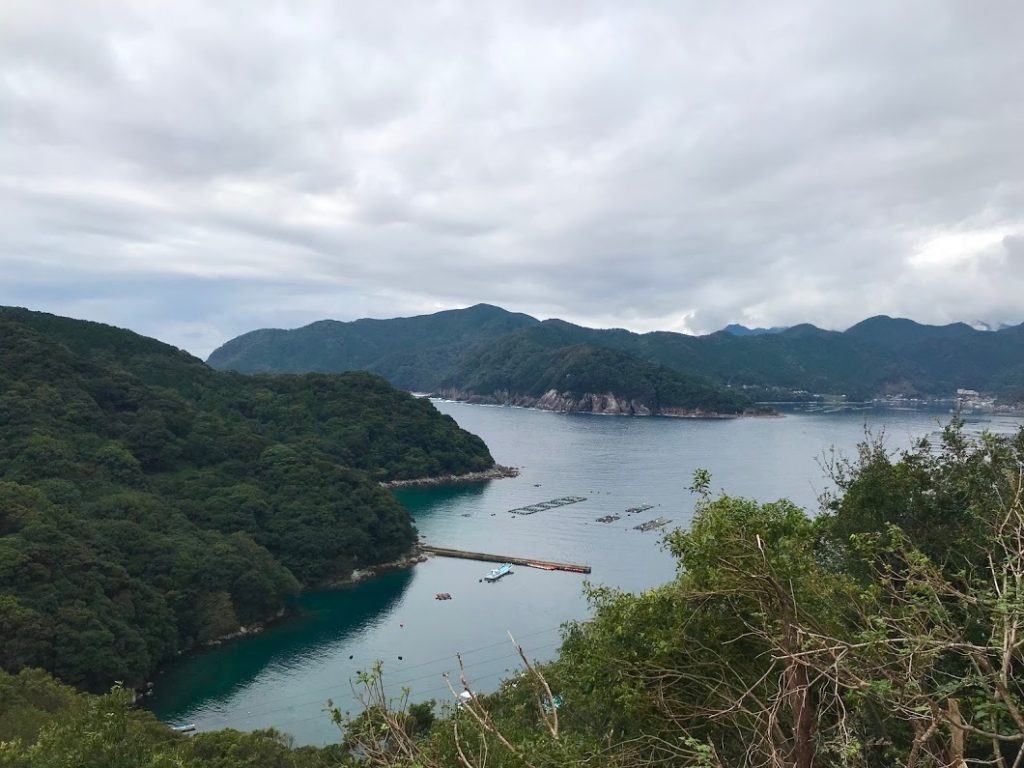 距離があるので先を急ぐ。途中、国道から見えた景色。綺麗だよな。尾鷲湾とはまた別の湾。熊野市より。湾で養殖をしてるんだな・・・