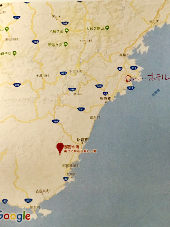 朝食をいただいたら、次の訪問地へ。ホテルから、熊野古道・那智の滝へ。位置関係は地図写真をご覧ください。