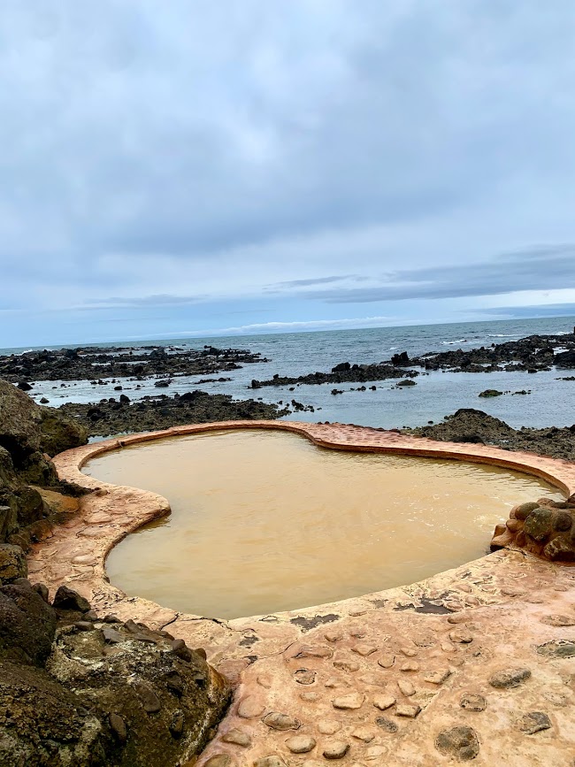 この露天風呂のお湯の量は、常に一定に保たれているみたいだ。よく見るとあふれた温泉は全部海に流れており、その海に出た部分は海水がオレンジ色になっている。湧き出てくる温泉と流れていく温泉の量が、ちょうどバランスが取れているんだな。