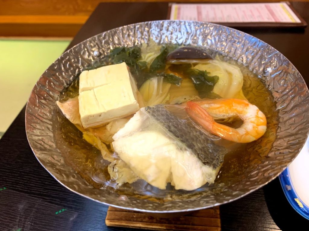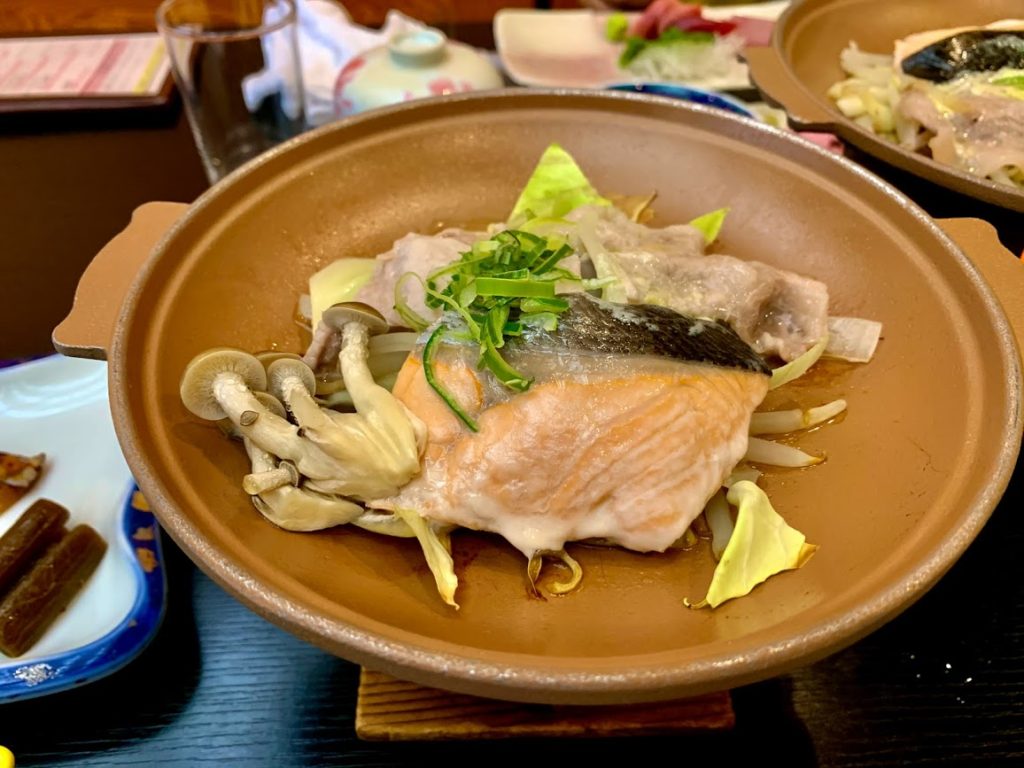 本マスといわき高原豚のバター陶板焼き、そして海鮮鍋。両方とも美味しな。
