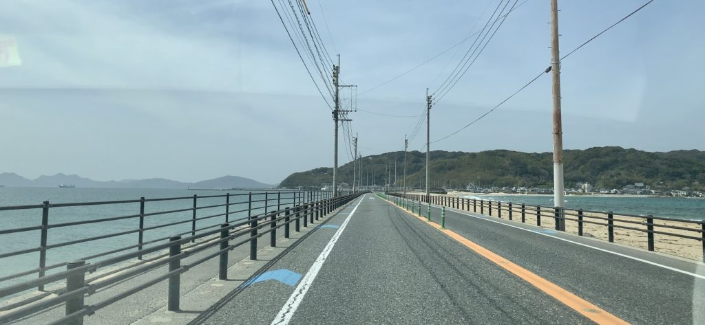 島に近づくにつれて道路の両側に海が広がる「海の中道(なかみち)」。綺麗だよな。