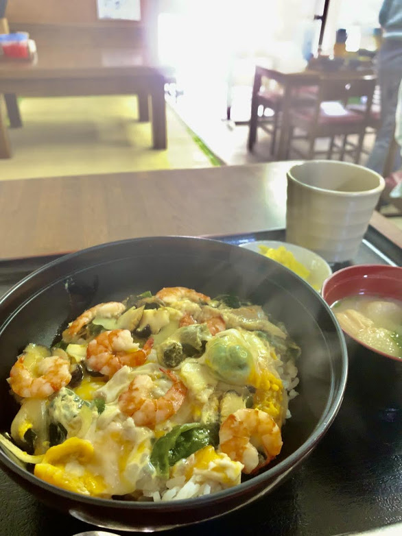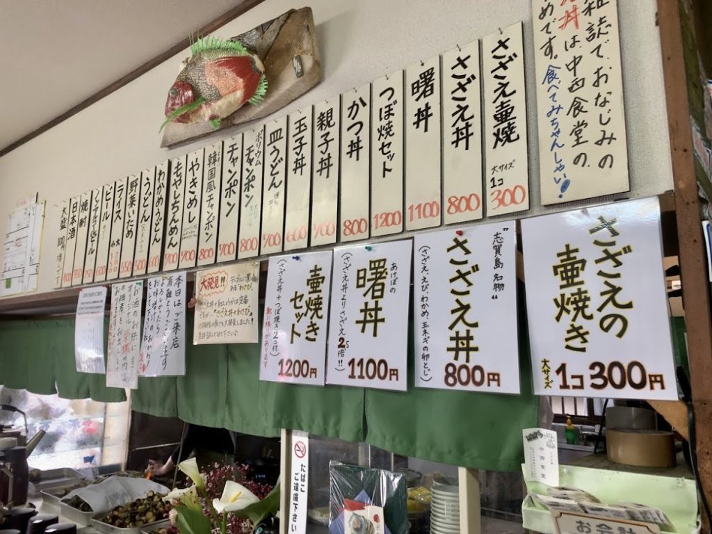 中西食堂の名物と言えば、サザエ丼の2倍のサザエがトッピングされた「曙丼」。こりこりの食感のサザエ、採れたての新鮮ワカメ、海老などを玉子でとじた丼で、一口食べてみると口の中に磯の香りがふわっと広がります。