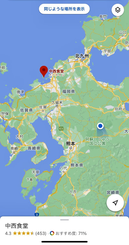 位置関係を。福岡に行くのなら、まずは能古島(のこのしま)に行ってみたいと思っていた。ここは井上陽水の「能古島の片思い」で唄われている島で、私は彼のファンだから。一方で地図を見ると、その少し北に陸続きの「志賀島(しかのしま)」がある。ここは沖縄に旅した時の海中道路に似ているな。そう思った。ググってみると海と心地よい風にリフレッシュ。車で行けちゃう「志賀島」の魅力大公開というHPがあり、いい感じ。ならばここを訪れ、ランチはやはりHPで紹介されている中西食堂でさざえ丼をいただこうかな。こんな行動計画が思い浮かび、実現した次第。