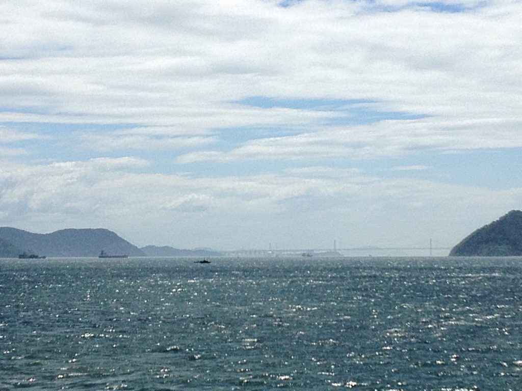 40分ぐらい乗船していると、西側はるか遠くに、瀬戸大橋が、見えてきた!!きれいな橋。文字通り、四国から本州、橋渡しをしているな。JRで移動する場合は、この橋を渡るんだよな。