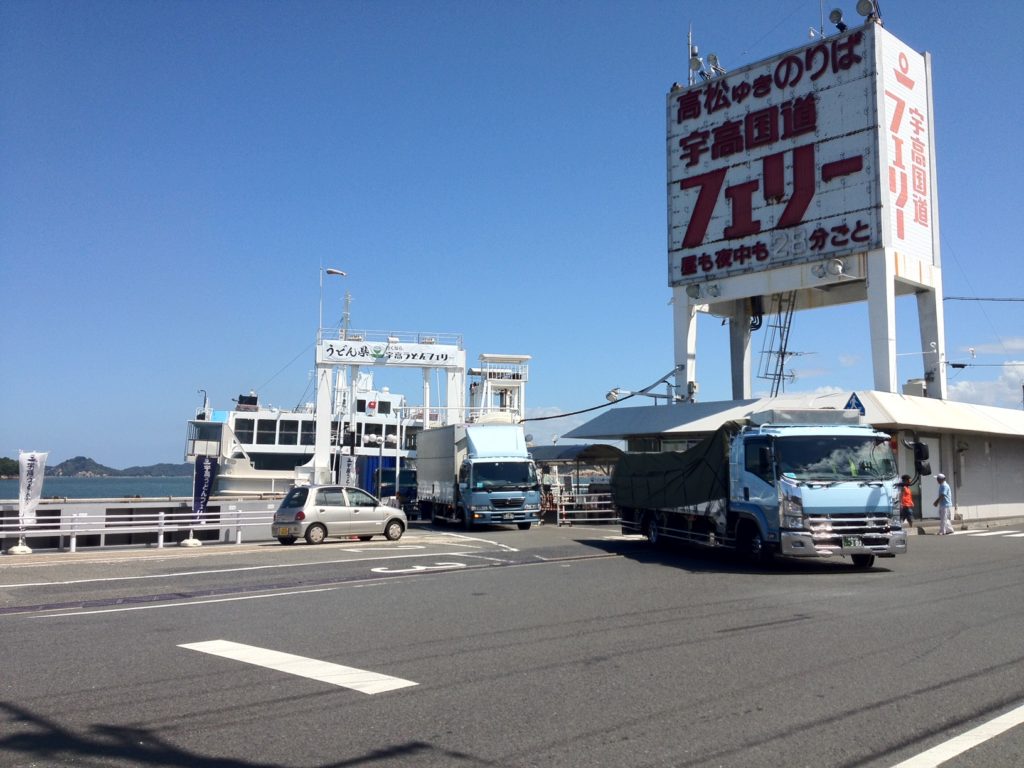 宇野に到着。船旅はおしまい。フェリーなので、車がどんどん、出てくる。大型トラックが多いな。産業用フェリーと、あらためて実感。1時間、車の中で寝ていた人もいたみたいだな。