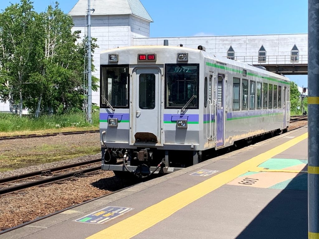 JR富良野線、富良野発旭川行き鈍行、キハ150形気動車。1両編成。さきのHP、ラベンダー畑で紹介した列車と同じだな。近くで見るとこんな感じだ。レンタカーでドライブしながら、たまたま駅に立ち寄る。するともうすぐテツがやってくる、あるいはそこにテツが着いてるというシチュエーションは、なんとも好きだな。