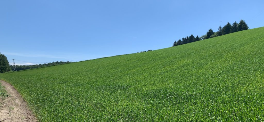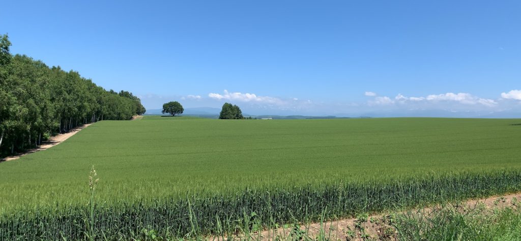 6月末の美瑛だ!どの写真も美瑛らしい、広がりのある畑。ただ7月から8月にかけてとは異なり、まだ緑一色だったり苗を植えたばかりで、土の隙間が見える畑も少なくない。麦畑も、これは7月後半になるといわゆるGolden Wheat、金色に光る畑になるんだが、今はまだまだ、濃淡あれど、緑一色だよな。
