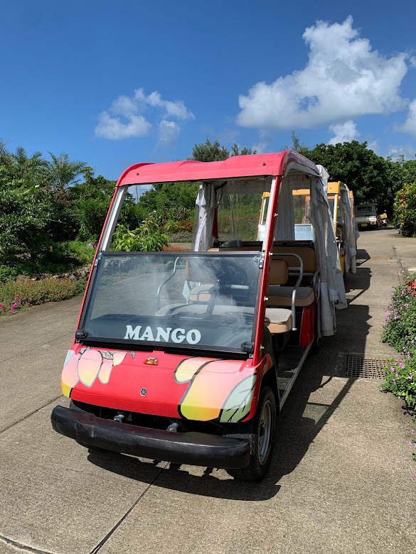 宮古島東急ホテル&リゾーツをチェックアウト。そこから車で3分位行ったところに、宮古島熱帯果樹園 まいぱりという、なんとも魅力的な響きの果樹園がある。HPを見るとすぐにYou tube動画があって、カートに乗って周遊している女性二人が嬉しそう。俺も乗ってみたくなった。なかなか楽しめたな。