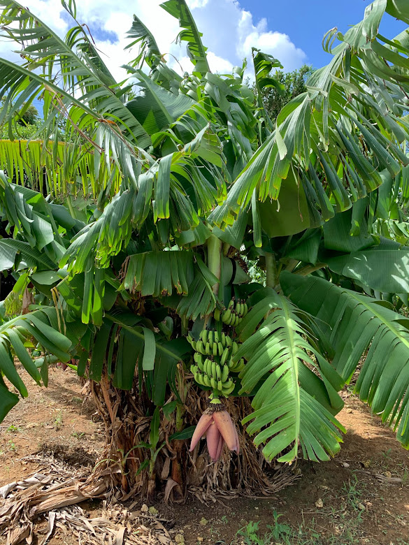 バナナの木。小さな実がなってる。熟せばもちろん食べられるし、この果樹園でも売っている。いいよな。