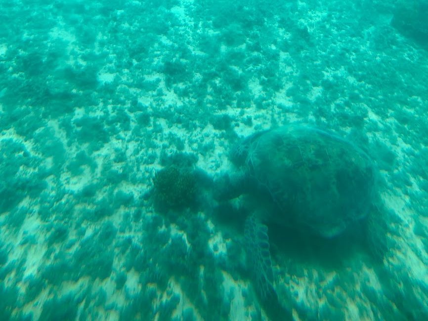 これは野生のアオウミガメ。ホテルブリーズベイマリーナの浜のそれほど遠くないところで、海藻を食べているらしい。ここに棲んでいるのかな。でもまあ、君と出会えて嬉しかったよ。