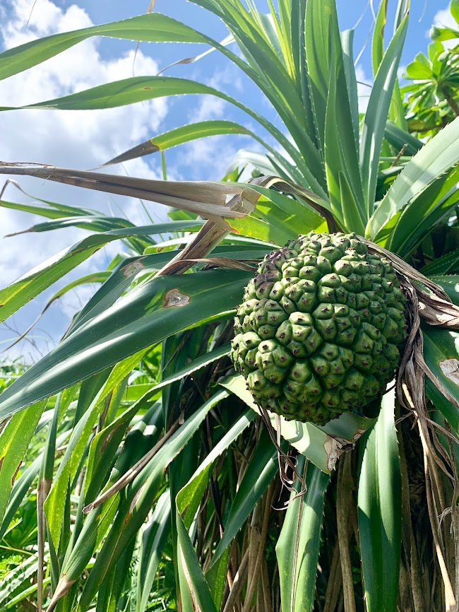 通り池の駐車場から池に向け歩く途中の景色。これはアダン(タコノ木)という植物の果実。ヤシガニの好物らしい。こういうのを目撃できるのはとても嬉しい。南国だよな・・・