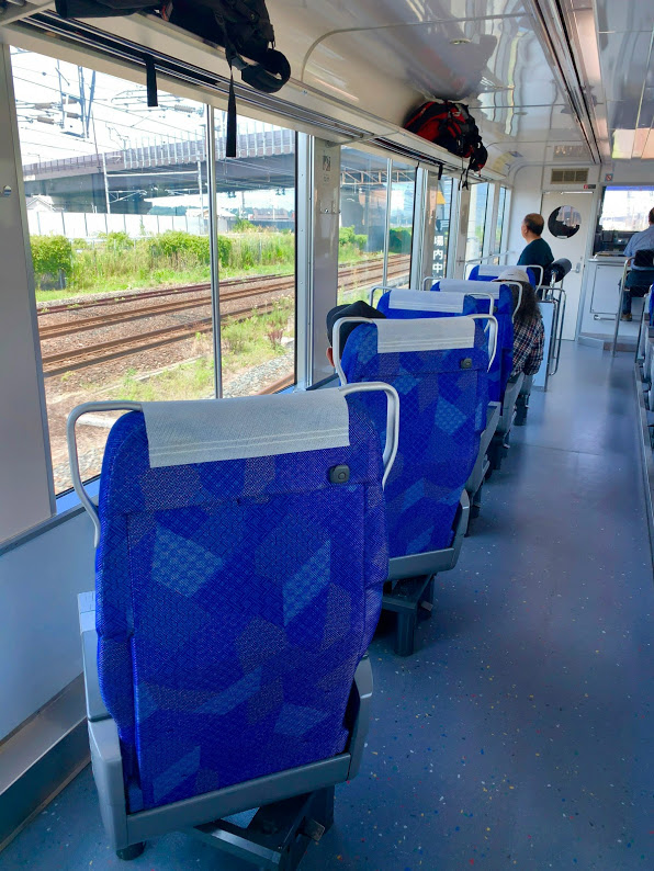 行きの車内。指定席で、海が見える進行方向右側は一人掛け、しかも少し右に傾いて、海景色が良い塩梅に見えるような配慮がしてある。窓も大きい。これは