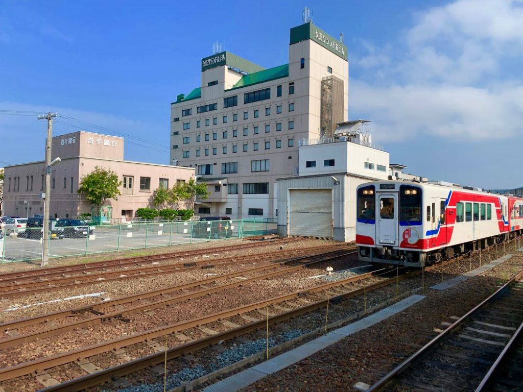 久慈に到着。デジャブかな・・・岩手銀行久慈支店と久慈グランドホテルと三陸鉄道車両。東日本大震災の2週間前にもここから、同じ景色を見ていた。何とも