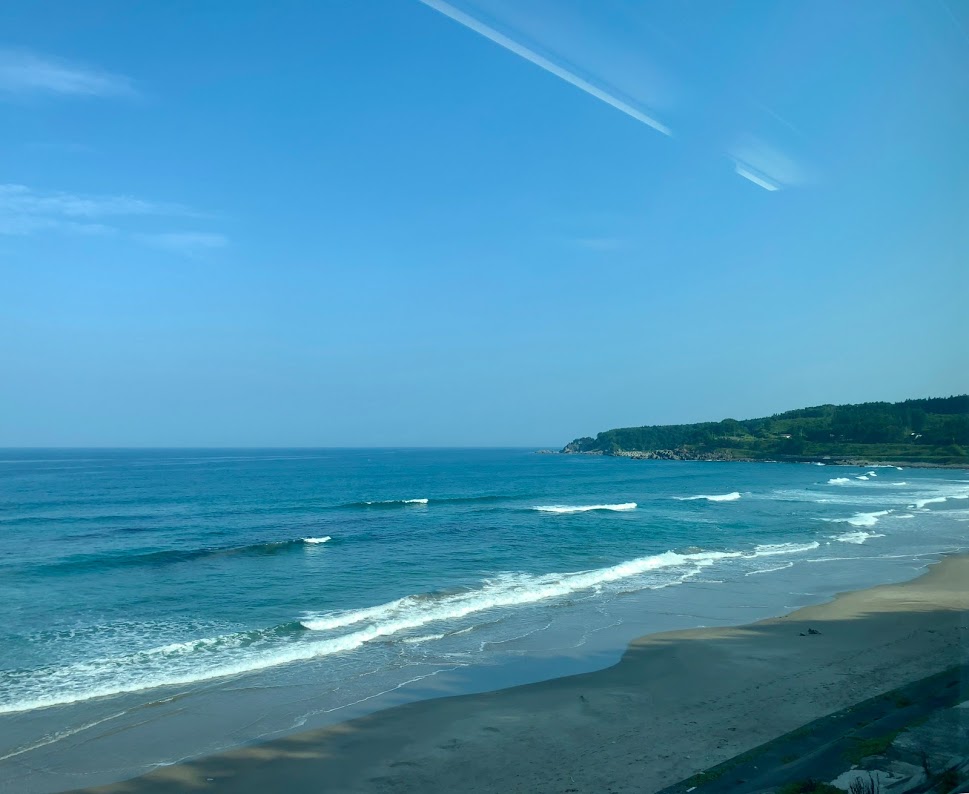 JR八戸線は、天気に恵まれた日にこの「リゾートうみねこ」に乗ることを前提に、おススメ。晴れていれば、このように北東北の太平洋を堪能できる。一方でJR八戸線車両は、多くは老朽化していて窓が汚れ、景色が綺麗に見えないケースが往々にしてある。故に現状では、この線に乗るなら「リゾートうみねこ」一択でしょうね。