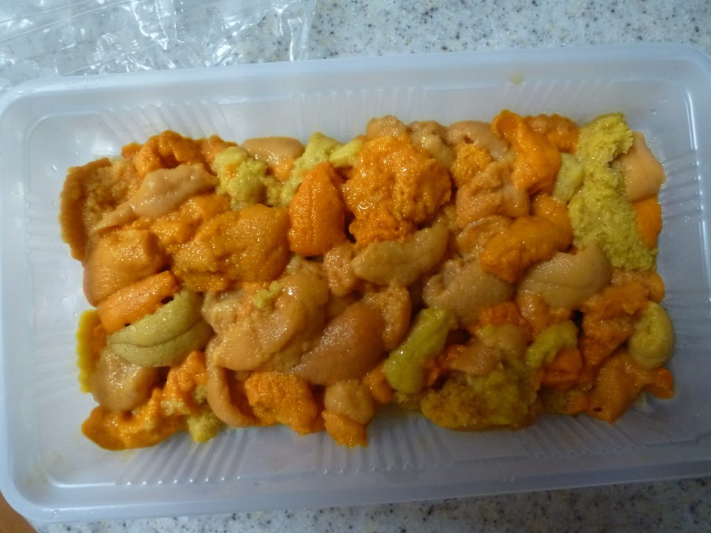 三陸産。6~8月が旬。宮古市魚菜市場、そして宮古のウニ!と同じですね。ミョウバンが入ってない、正真正銘の生うに。だから3日もすれば、溶けてドロドロになってしまうと、脅かされた。オレンジ色が濃いのはバフンウニ、薄いのはムラサキウニだそうな。両者を食べ比べると、味は。。。バフンウニのほうが、より、濃厚なのかな?。。。う~む。とにかく、旨し。これは、贅沢ですって。