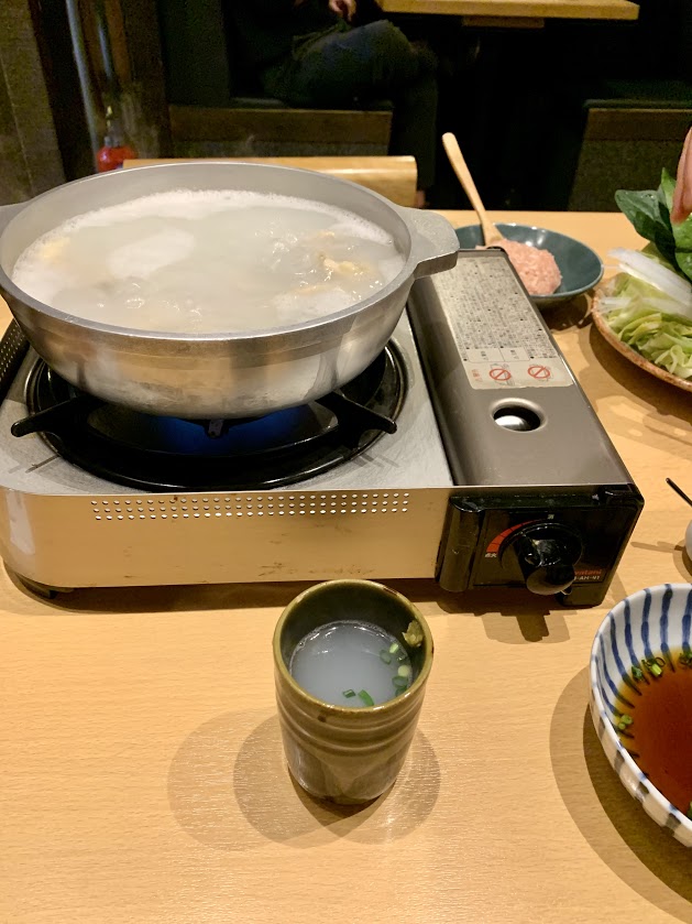 博多の鶏の水炊きの具材が用意された後、いろいろと用意してくれた女性曰く。「まずは、お店自慢の出汁に塩を入れたスープを一杯作りますんでね。ぜひ飲んでみて下さい。これがこの店、鶏の水炊きの最初ですんでね」とのニュアンスを、博多弁で。そうか・・・スープはおいしかったし、偶然取れたこの女性の視線がなんとも・・・とな?(笑)