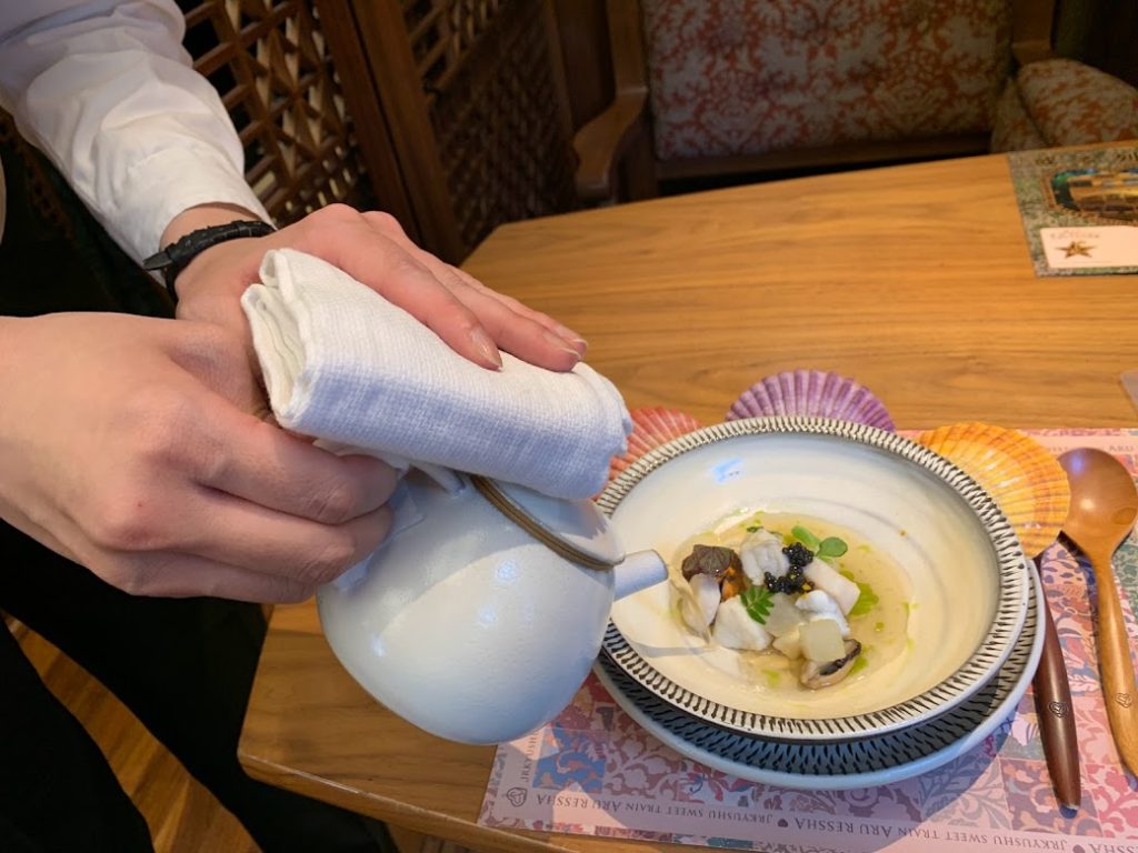 トラフグ、ヒオウギ貝、ムール貝のスープ。予めお皿に具が入っていて、そこに鰹節由来のスープをかけると…