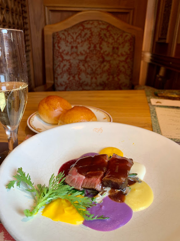 黒毛和牛のステーキ、地元野菜とキノコのピューレ。美味し…こっそり持ち込んだ赤ワインによく合う。ピューレ、天然色でこんなにカラフルになるんだな。驚いた…