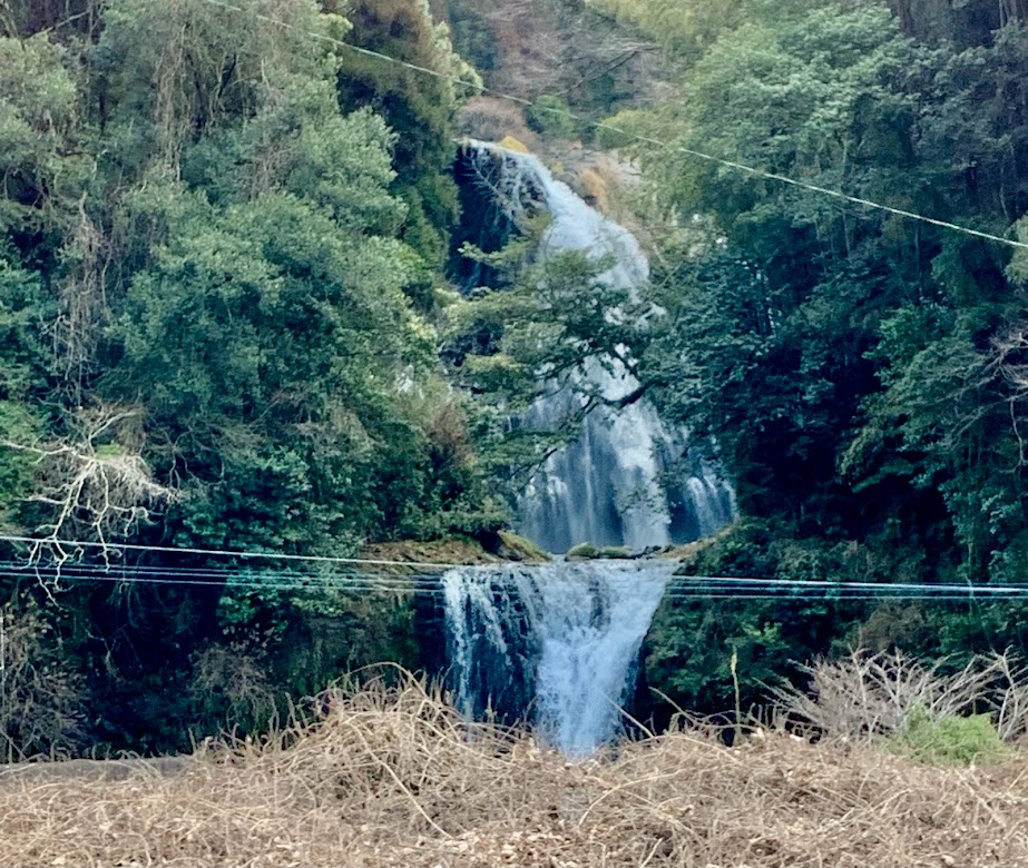 しばらくすると、列車のアテンダントさんからアナウンスが。 もうじき右側に小さな滝が見えてきますよ。慈恩の滝といいますと。これがそれ。 久大本線の名物だよな。 スピードをゆっくりにしてくれた。 みんな写真撮ってた。 いいよな。