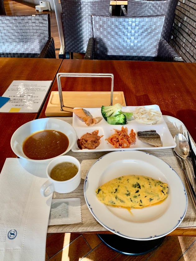 レストラン「パインテラス」で朝食ビュッフェを。 昨日の夕食はクラブラウンジのアテで済ませた。軽めの食事だったから、朝からお腹が空いてる。これは好都合、ここのビュッフェがおいしいことは、すでに分かっているので楽しみだ・・・と、やっぱりいいな。何を食べても美味しかった。オムレツ・オニオンスープ・カレー・・・などなど。