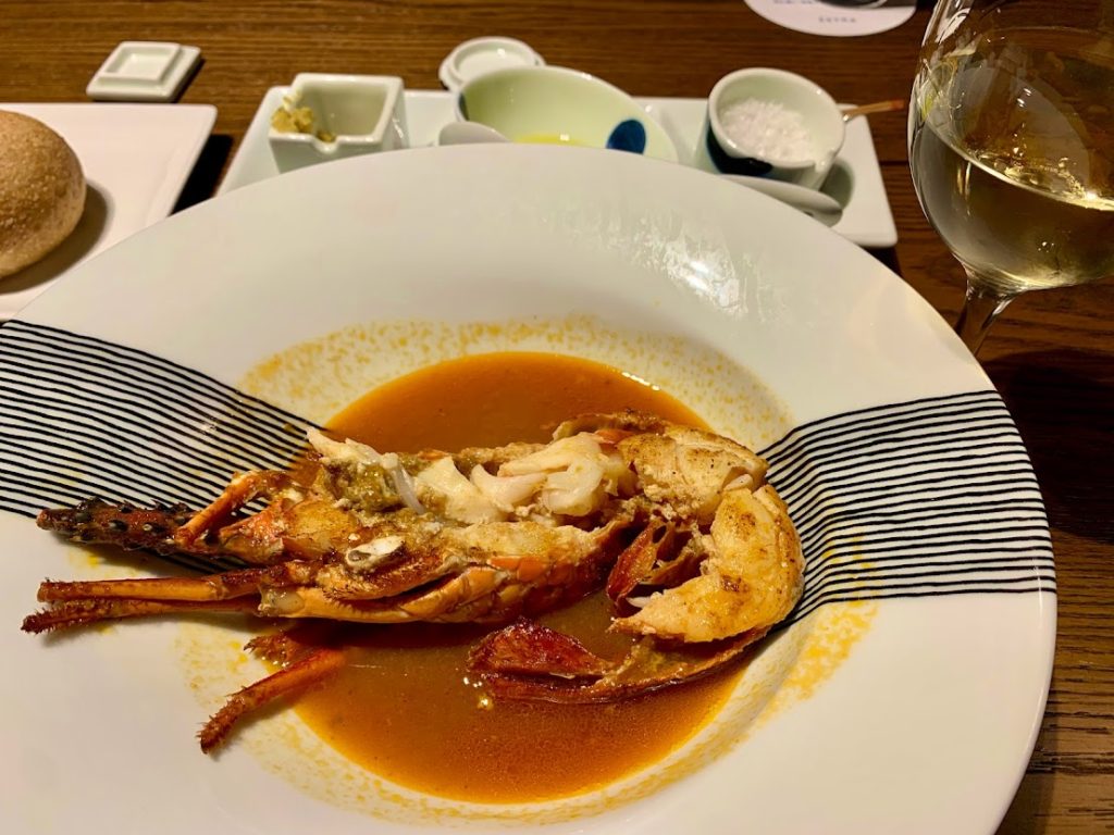 長崎県産伊勢エビのブイヤベース。とんでもなく美味しな。 それにしても、伊勢海老一匹だけでブイヤベースというものが存在するんだな。豪勢というべきなのか・・・