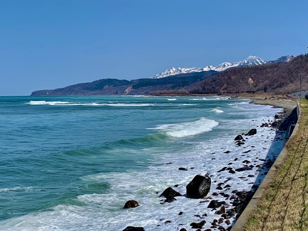 さらに国道391号を進んでいくと、知床の海が。きれいだよな。同じオホーツクでも北浜あたりに比べると、岩場だからかな。波が荒いことがよくわかる。