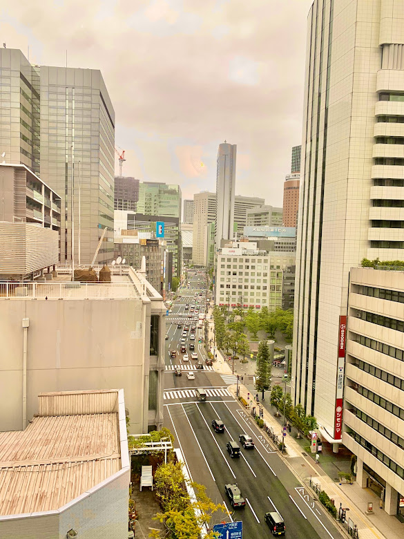 ホテルの部屋から、JR大阪駅方面を望む。眼下にあるのは、四ツ橋筋。いいな。