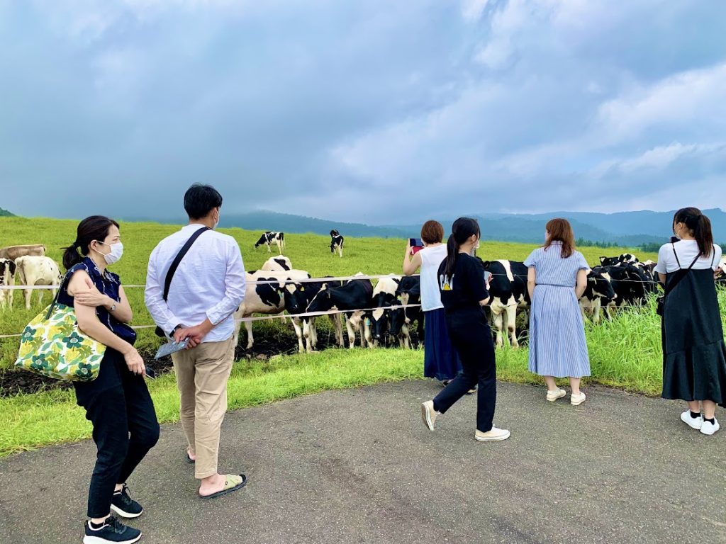 tハンバーガーを食べて、再びナイタイ高原牧場を散策。ここはやっぱり、ホルスタイン、人気者だよな。みんなも楽しそうだ。