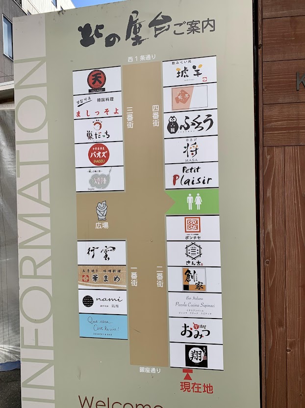 昨日楽しい時間を過ごさしてもらった、北の屋台も再訪する。朝行くとこんな感じ。横丁の地図を大きく写真に撮った。お店の位置関係と名前が確認できた。よかったよかった。