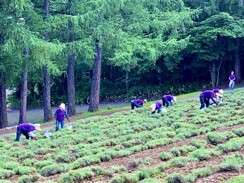 なんだろう。ラベンダー以外だと思うが、ファーム富田で、作業をしてくれている女性が。この暑い中、頭が下がるな。でもみんな、ラベンダー色の上着を着て作業をされているんだな。