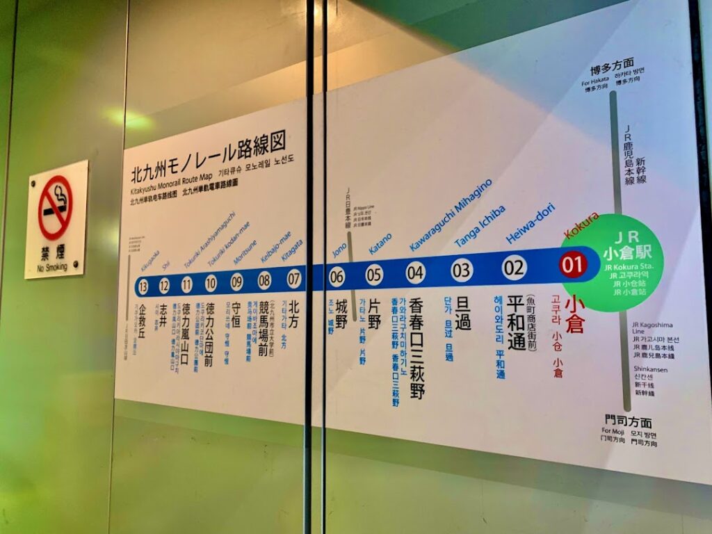 北九州モノレールの路線図。旦過は小倉から二つ目なんだな。
